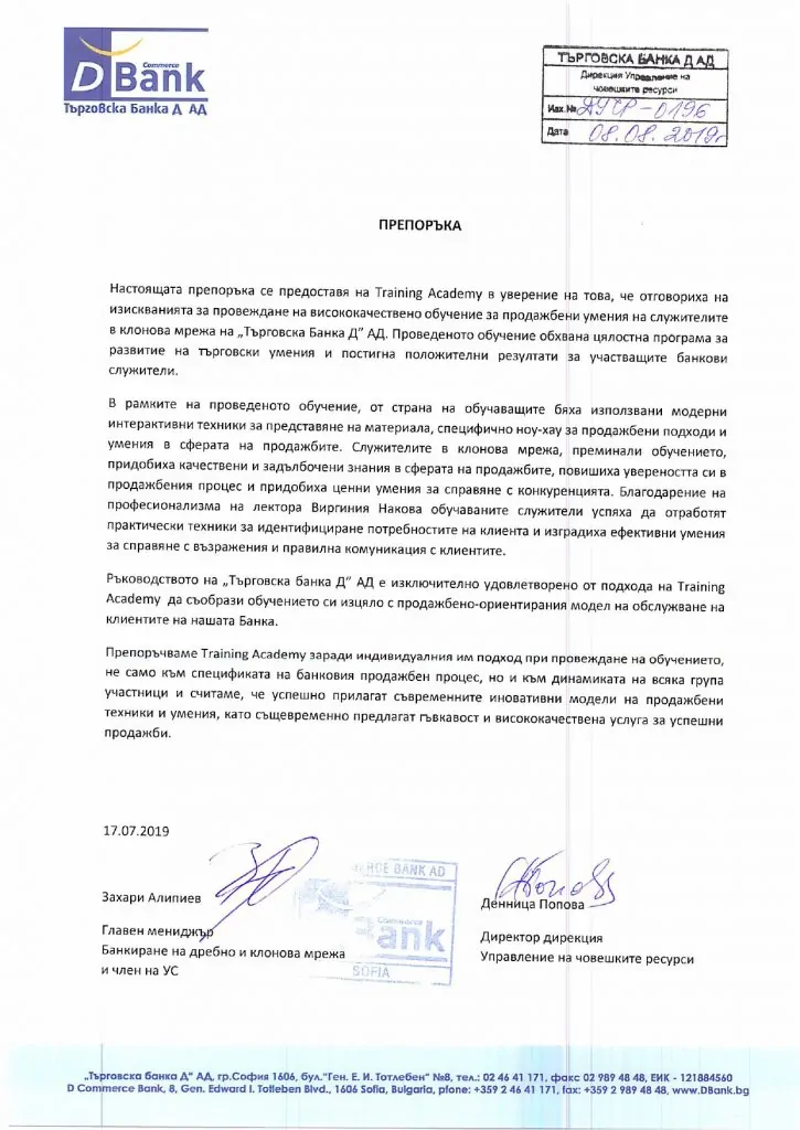 Настоящата препоръка се предоставя на Training Academy в уверение на това, че отговориха на изискванията за провеждане на висококачествено обучение за продажбени умения на служителите в клонова мрежа на „Търговска банка Д“ АД. Проведеното обучение обхвана цялостна програма за развитие на търговски умения и постигна положителни резултати за участващите банкови служители.