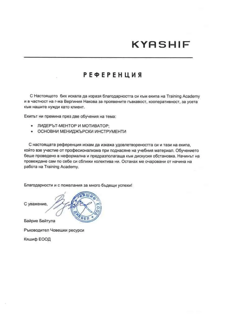 С настоящото бих искала да изразя благодарността си към екипа на Training Academy и в частност г-жа Вергиния Накова за проявените гъвкавост, кооперативност, за усета към нашите нужди като клиент.